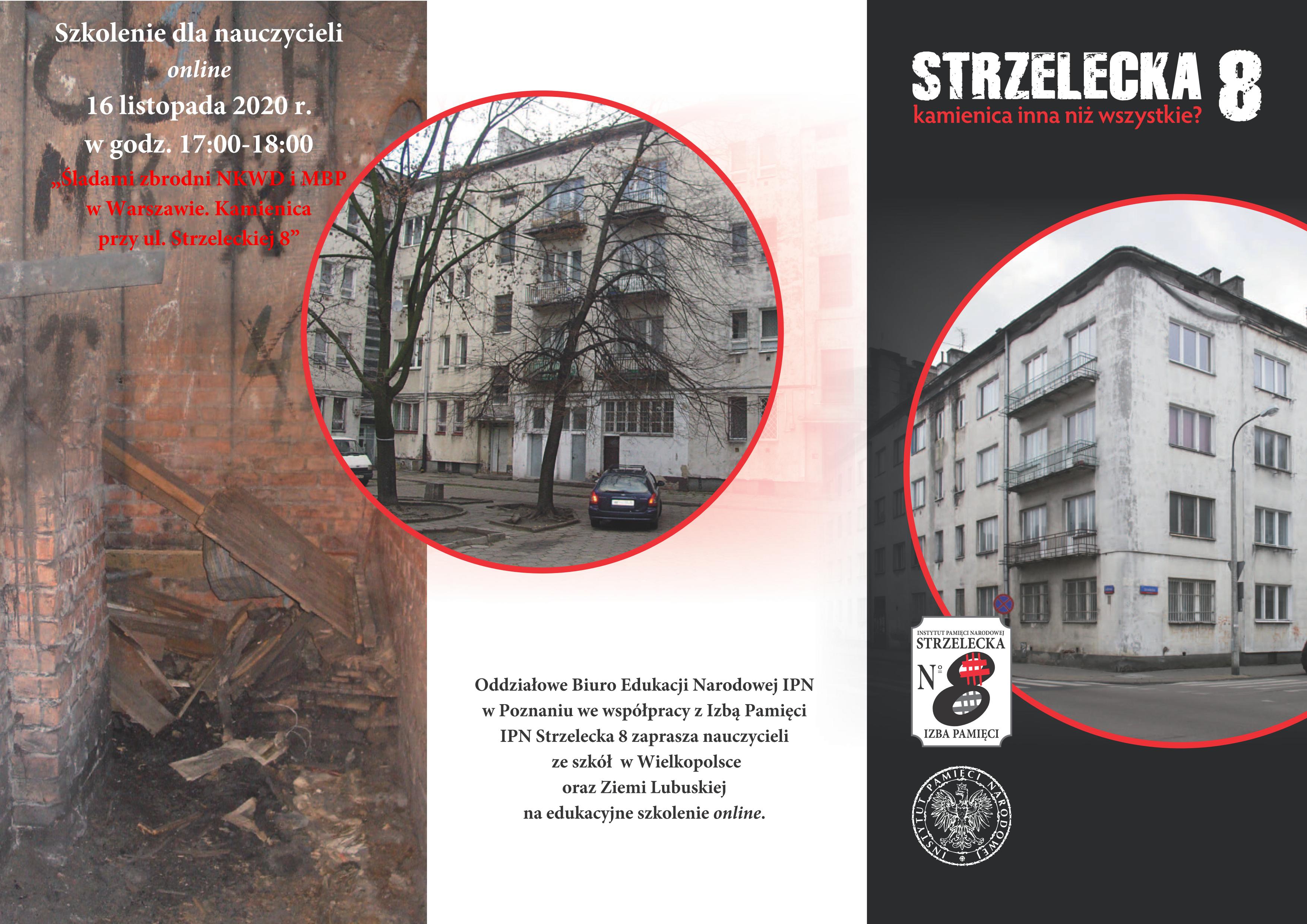 Oddziałowe Biuro Edukacji Narodowej IPN w Poznaniu we współpracy z Izbą Pamięci IPN Strzelecka 8 zorganizowało szkolenie online dla nauczycieli ze szkół w Wielkopolsce oraz Ziemi Lubuskiejpt.„Śladami zbrodni NKWD i MBP w Warszawie. Kamienica przy ul. Strzeleckiej 8” .