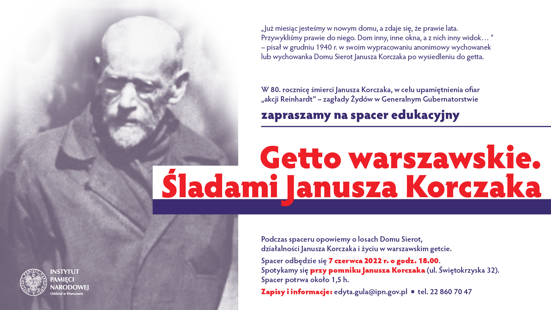 W 80. rocznicę śmierci Janusza Korczaka, w celu upamiętnienia ofiar „akcji Reinhardt” – zagłady Żydów w Generalnym Gubernatorstwie Oddziałowe Biuro Edukacji Narodowej IPN w Warszawie zorganizowało spacer edukacyjny „Getto warszawskie. Śladami Janusza Korczaka”. Uczestnicy dowiedzieli się o losach Domu Sierot, działalności Janusza Korczaka i życiu w warszawskim getcie.