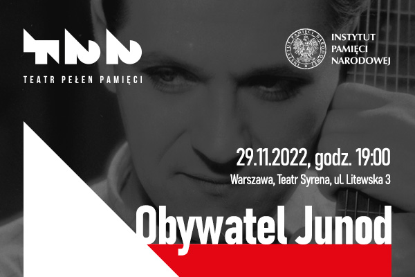 Instytut Pamięci Narodowej wraz z Towarzystwem Społeczno-Kulturalnym Żydów w Polsce zapraszają na sztukę teatralną Obywatel Junod w reżyserii Jakuba Kornackiego, która będzie wystawiona na deskach Teatru Syrena 29 listopada 2022 r. o godzinie 19.00.