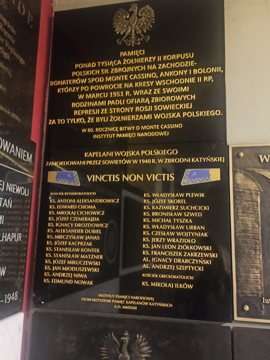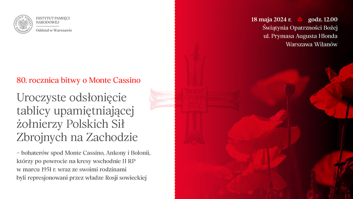 W sobotę 18 maja 2024 r. w Świątyni Opatrzności Bożej odbyło się uroczyste odsłonięcie tablicy upamiętniającej żołnierzy Polskich Sił Zbrojnych na Zachodzie – bohaterów spod Monte Cassino, Ankony i Bolonii, którzy po powrocie na kresy wschodnie II RP w marcu 1951 r. wraz ze swoimi rodzinami byli represjonowani przez władze Rosji sowieckiej.