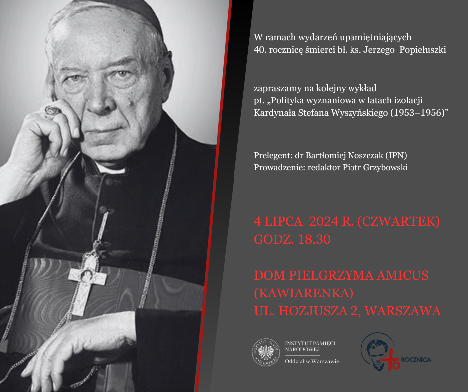 W czwartek 4 lipca 2024 r. o godz. 18.30 w ramach wydarzeń upamiętniających 40. rocznicę śmierci bł. ks. Jerzego Popiełuszki w Domu Pielgrzyma AMICUS (kawiarenka) w Warszawie miał miejsce kolejny wykład „Polityka wyznaniowa w latach izolacji Kardynała Stefana Wyszyńskiego (1953–1956)”.