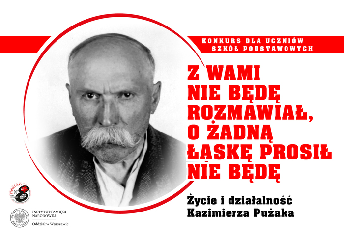 Oddziałowe Biuro Badań Historycznych Instytut Pamięci Narodowej Oddział w Warszawie i Strzelecka 8 - Izba Pamięci zapraszają uczniów klas IV-VIII szkół podstawowych z województwa mazowieckiego do udziału w konkursie pt. „Z wami nie będę rozmawiał, o żadną łaskę prosił nie będę”. Życie i działalność Kazimierza Pużaka.