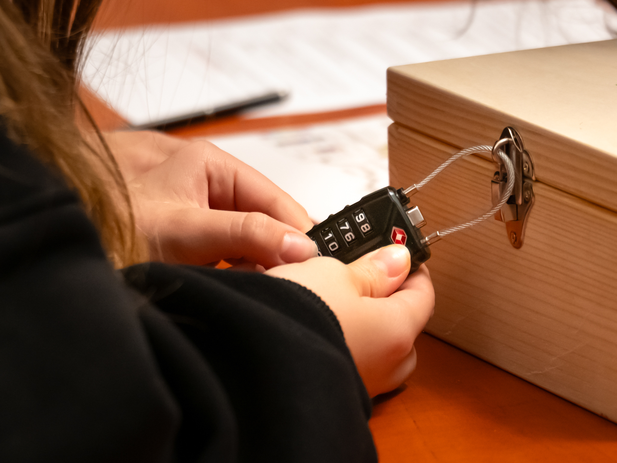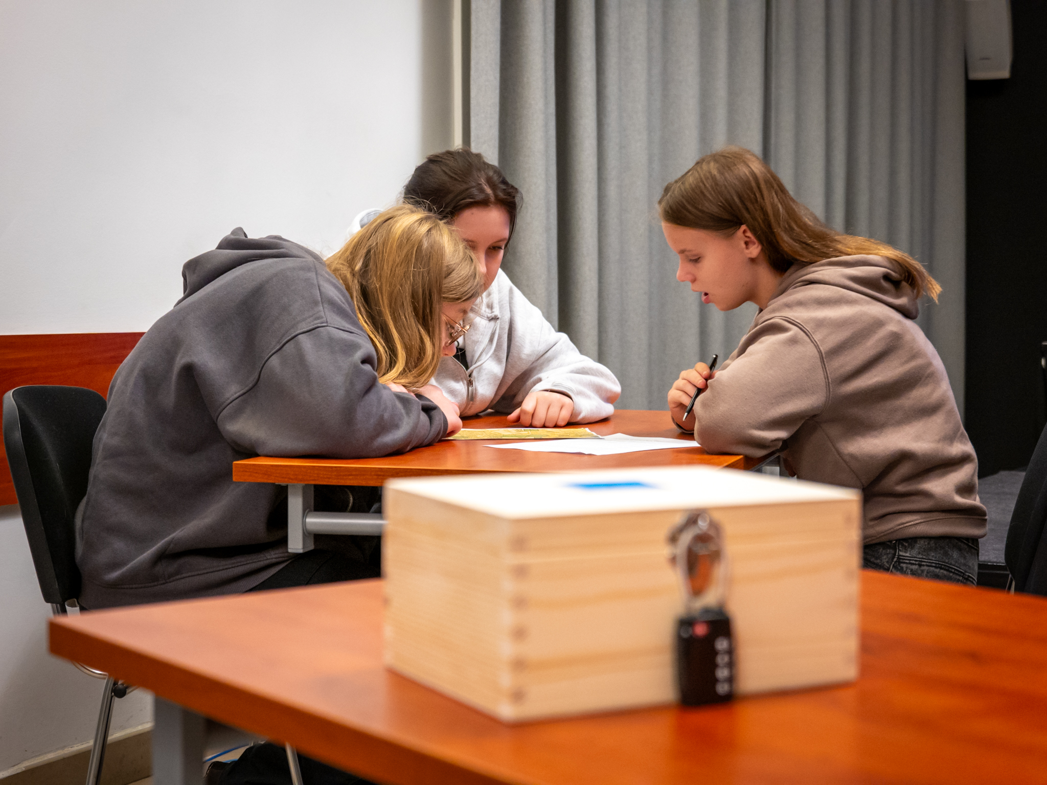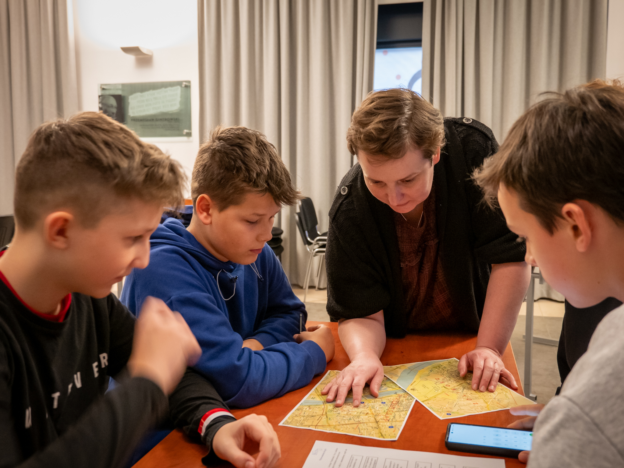 Druga część warsztatów przybrała formę ekscytującego escape roomu. Uczniowie podzieleni na grupy, mieli za zadanie odnaleźć ukryte na sali zakodowane skrzynki i rozwiązać zestaw łamigłówek, które prowadziły do kolejnych wskazówek. W ostatniej skrzynce czekała na nich niespodzianka, a po zakończeniu tej emocjonującej zabawy młodzież podjęła refleksję na temat znaczenia niepokonanej postawy w różnych okresach historii Polski.