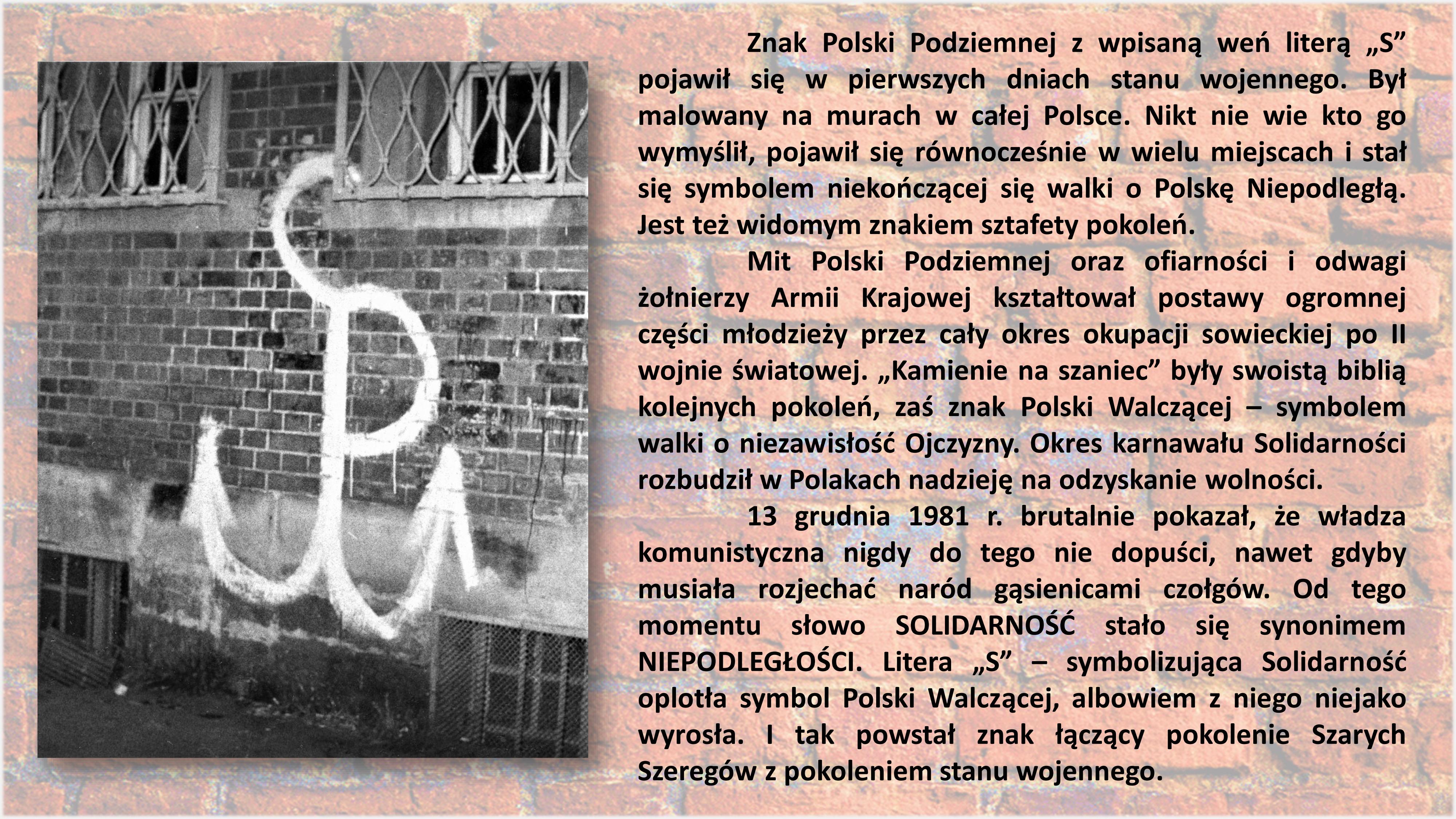 Znak Polski Podziemnej z wpisaną weń literą „S” pojawił się w pierwszych dniach stanu wojennego. Był malowany na murach w całej Polsce. Nikt nie wie, kto go wymyślił – pojawił się równocześnie w wielu miejscach i stał się symbolem niekończącej się walki o Polskę Niepodległą. Jest też widomym znakiem sztafety pokoleń.