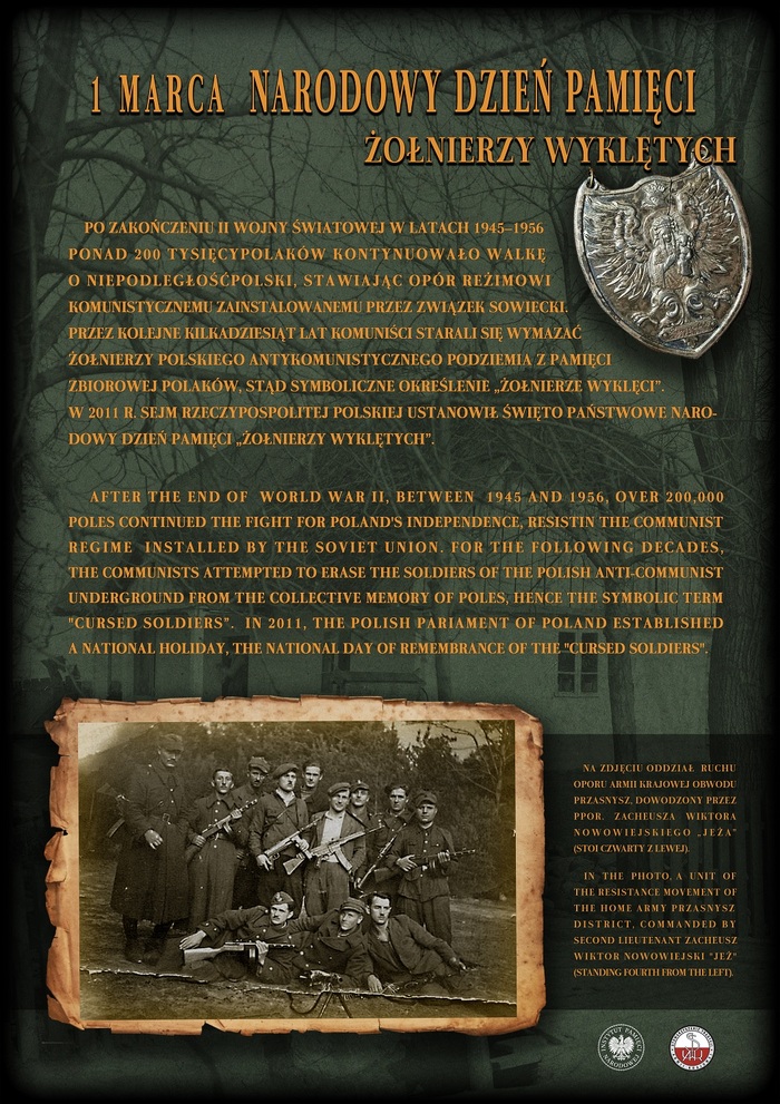 Po zakończeniu II wojny światowej w latach 1945–1956 ponad 200 tysięcy Polaków kontynuowało walkę o niepodległość Polski, stawiając opór reżimowi komunistycznemu zainstalowanemu przez Związek Sowiecki. Przez kolejne kilkadziesiąt lat komuniści starali się wymazać żołnierzy polskiego antykomunistycznego podziemia z pamięci zbiorowej Polaków, stąd symboliczne określenie „żołnierze wyklęci”. W 2011 r. Sejm Rzeczypospolitej Polskiej ustanowił 1 marca świętem państwowym – Narodowym Dniem Pamięci „Żołnierzy Wyklętych”.