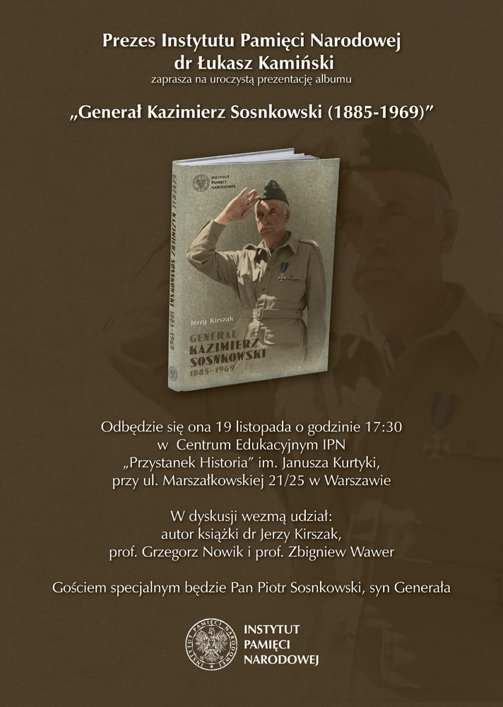 W poniedziałek, 19 listopada 2012, dokładnie w 127 rocznicę urodzin, w Centrum Edukacyjnym IPN w Warszawie odbyła się promocja wydanego przez Instytut albumu Jerzego Kirszaka „Generał Kazimierz Sosnkowski 1895–1969”. Na zaproszenie prezesa IPN na tę uroczystość przyszli historycy, urzędnicy państwowi, zachodni dyplomaci i kombatanci. Gośćmi honorowym byli najmłodszy syn generała Piotr oraz Halina Babińska, od lat przyjaciółka rodziny Sosnkowskich. W dyskusji – prowadzonej przez szefa Biura Edukacji Publicznej IPN dra Andrzeja Zawistowskiego – o postaci generała i wydanym albumie wzięli udział autor albumu oraz historycy, profesorowie Zbigniew Wawer i Grzegorz Nowik.