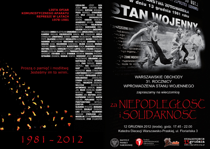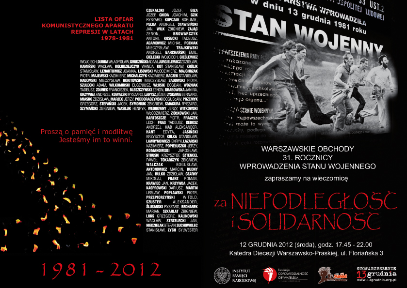 12 grudnia 2012 r. w Katedrze Warszawsko-Praskiej (ul. Floriańska 5, Warszawa) odbyła się wieczornica pt. „Za niepodległość i solidarność” w hołdzie ofiarom stanu wojennego. W intencji ofiar stanu wojennego odprawiona została msza św., następnie odczytano apel poległych oraz wystąpił Międzyuczelniany Chór Akademicki PRO PACE.