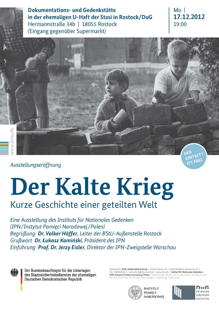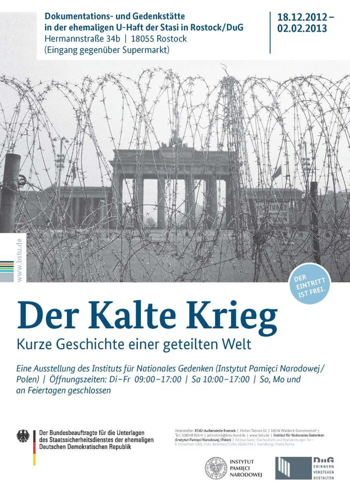 W ramach cyklu prezentacji w Niemczech wystawy „Zimna wojna. Krótka historia podzielonego świata” (w niemieckiej wersji językowej), przygotowanej przez Oddział Instytutu Pamięci Narodowej w Warszawie, w dniu 17 grudnia 2012 r. miało miejsce otwarcie wystawy w Rostocku – na zaproszenie Bundesbeauftragte für die Stasi-Unterlagen „Gauck-Behörde“ (filii tzw. Instytutu Gaucka) – w dawnym więzieniu Stasi, które obecnie pełni funkcję Muzeum Politycznego i Miejsca Pamięci. Ekspozycja zorganizowana została we współpracy z Centrum Badań Historycznych Polskiej Akademii Nauk w Berlinie.