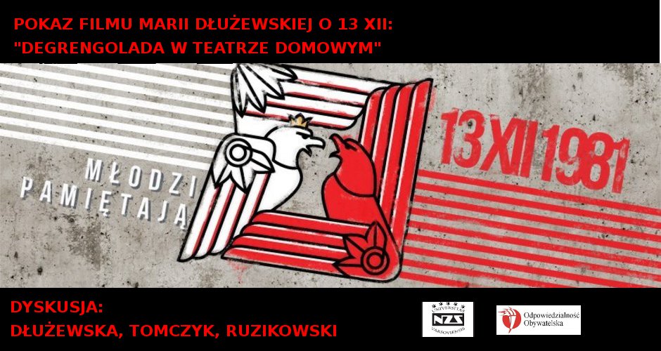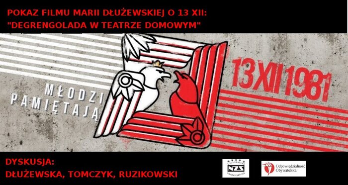Niezależne Zrzeszenie Studentów UW zorganizowało pokaz filmu i dyskusję w ramach cyklu Nowe Kino Historyczne. 11 grudnia o godzinie 20.00 w Dawnej Bibliotecei Uniwersytetu Warszawskiego został zaprezentowany film „Degrengolada w teatrze domowym” w reżyserii Marii Dłużewskiej. Dokument opowiada o aktorach warszawskiego Teatru Powszechnego, którzy w czasie stanu wojennego wystawiali spektakle teatralne w prywatnych mieszkaniach. Jedno z takich spotkań przybrało niespodziewany obrót, a sztuka w zaskakujący sposób splotła się z rzeczywistością.