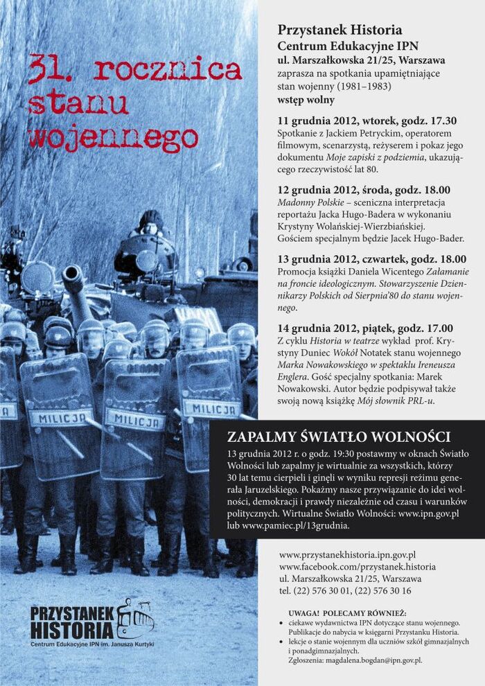Przystanek Historia Centrum Edukacyjne IPN, ul. Marszałkowska 21/25, Warszawa, zaprasza na spotkania upamiętniające stan wojenny (1981–1983).