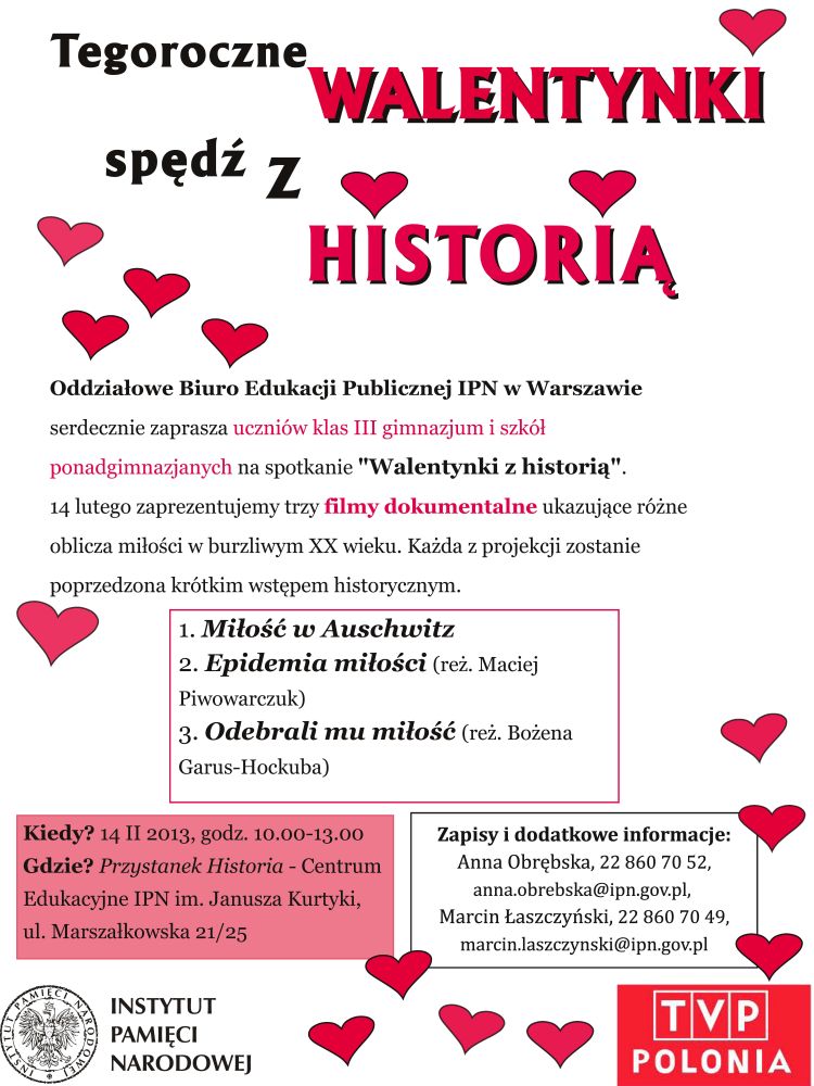 14 lutego br. w stołecznym Centrum Edukacyjnym IPN im. Janusza Kurtyki „Przystanek Historia”, przy ul. Marszałkowskiej 21/25, Oddziałowe Biuro Edukacji Publicznej IPN w Warszawie zorganizowało „Walentynki z historią”. W ramach spotkania zaprezentowane zostały filmy dokumentalne ukazujące różne oblicza miłości w burzliwym XX wieku.