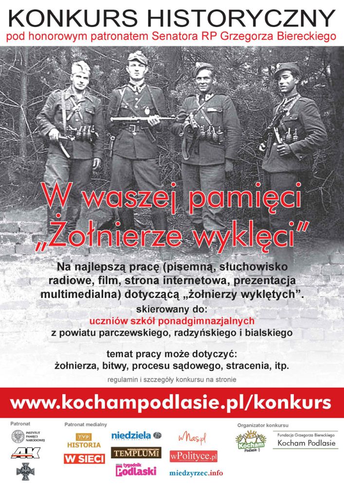 Fundacja Grzegorza Biereckiego Kocham Podlasie serdecznie zaprasza na uroczystą galę wręczenia nagród w konkursie „W naszej Pamięci Żołnierze Wyklęci”,która odbędzie się w Narodowy Dzień Pamięci Żołnierzy Wyklętych – 1 marca 2013 r., o godz.18.00, w Muzeum Południowego Podlasia, przy ul. Warszawskiej 12 w Białej Podlaskiej.