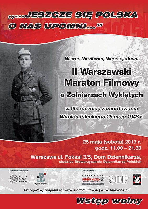 25 maja 2013 r. w godzinach 11.00 – 21.30 w Domu Dziennikarza (siedziba Stowarzyszenia Dziennikarzy Polskich) przy ul. Foksal 3/5 w Warszawie odbędzie się II Warszawski Maraton Filmowy o Żołnierzach Wyklętych pt. „Jeszcze się Polska o nas upomni...”.