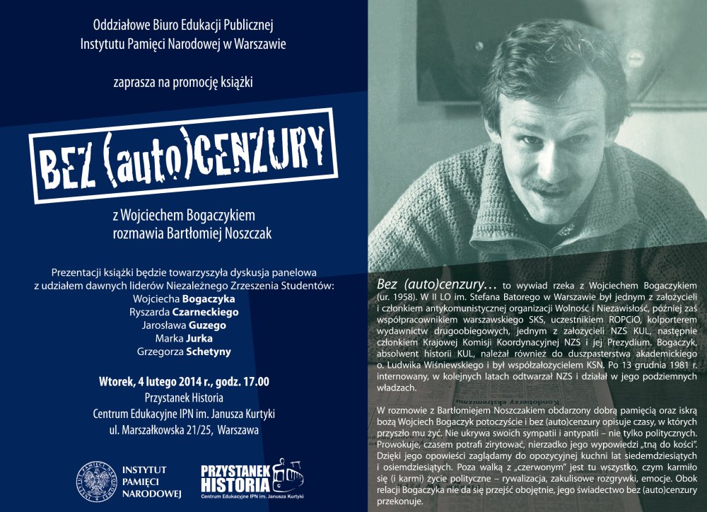 Historia opozycji i oporu społecznego w PRL cieszy się coraz większym zainteresowaniem miłośników Klio. Przekonuje o tym również prezentacja najnowszej książki Oddziałowego Biura Edukacji Publicznej IPN w Warszawie Bez (auto)cenzury. Z Wojciechem Bogaczykiem rozmawia Bartłomiej Noszczak. Spotkanie odbyło się we wtorkowy wieczór, 4 lutego br. w Centrum Edukacyjnym IPN im. Janusza Kurtyki Przystanek Historia przy ulicy Marszałkowskiej 21/25 w Warszawie. Prezentacji towarzyszyła dyskusja panelowa z udziałem dawnych liderów NZS: Wojciecha Bogaczyka, Jarosława Guzego i Marka Jurka.