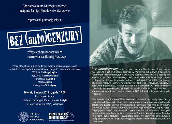 Bez autocenzury… to wywiad rzeka z Wojciechem Bogaczykiem (ur. 1958). W II LO im. Stefana Batorego w Warszawie był jednym z założycieli i członkiem antykomunistycznej organizacji Wolność i Niezawisłość, później zaś współpracownikiem warszawskiego SKS, uczestnikiem ROPCiO, kolporterem wydawnictw drugoobiegowych, jednym z założycieli NZS KUL, następnie członkiem Krajowej Komisji Koordynacyjnej NZS i jej Prezydium. Bogaczyk, absolwent historii KUL, należał również do duszpasterstwa akademickiego o. Ludwika Wiśniewskiego i był współzałożycielem KSN, po 13 grudnia 1981 r. internowany, w kolejnych latach odtwarzał NZS i działał w jego podziemnych władzach.