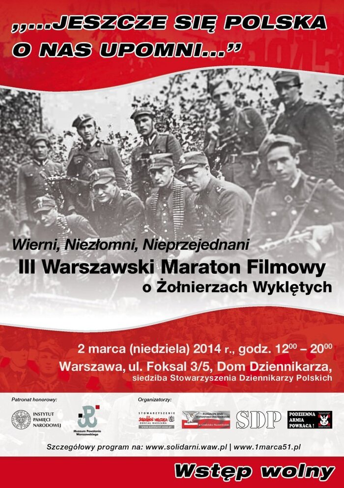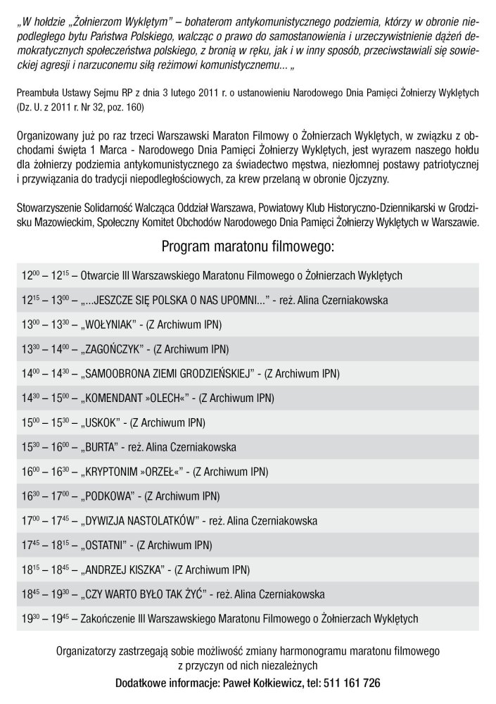 Stowarzyszenie Solidarność Walcząca Oddział Warszawa, Powiatowy Klub Historyczno-Dziennikarski w Grodzisku Mazowieckim, portal TuGrodzisk.pl, Stowarzyszenie Dziennikarzy Polskich oraz Społeczny Komitet Obchodów Narodowego Dnia Pamięci Żołnierzy Wyklętych zapraszają na III Warszawski Maraton Filmowy o Żołnierzach Wyklętych zorganizowany pod honorowanym patronatem Instytutu Pamięci Narodowej oraz Muzeum Powstania Warszawskiego w ramach obchodów Narodowego Dnia Pamięci Żołnierzy Wyklętych.
