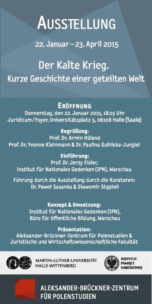 Kolejny raz Instytut Pamięci Narodowej ma możliwość zaprezentowania niemieckiej wersji wystawy „Zimna wojna. Krótka historia podzielonego świata”, przygotowanej przez Oddział Instytutu Pamięci Narodowej w Warszawie, której autorami są dr Paweł Sasanka i Sławomir Stępień. W ramach cyklu prezentacji w Niemczech wystawa pokazywana jest na zaproszenie i we współpracy z Centrum Studiów Polonoznawczych im. Aleksandra Brücknera na Uniwersytecie Marcina Lutra w Halle (Aleksander-Brückner-Zentrum für Polenstudien Martin-Luther-Universität Halle-Wittenberg).