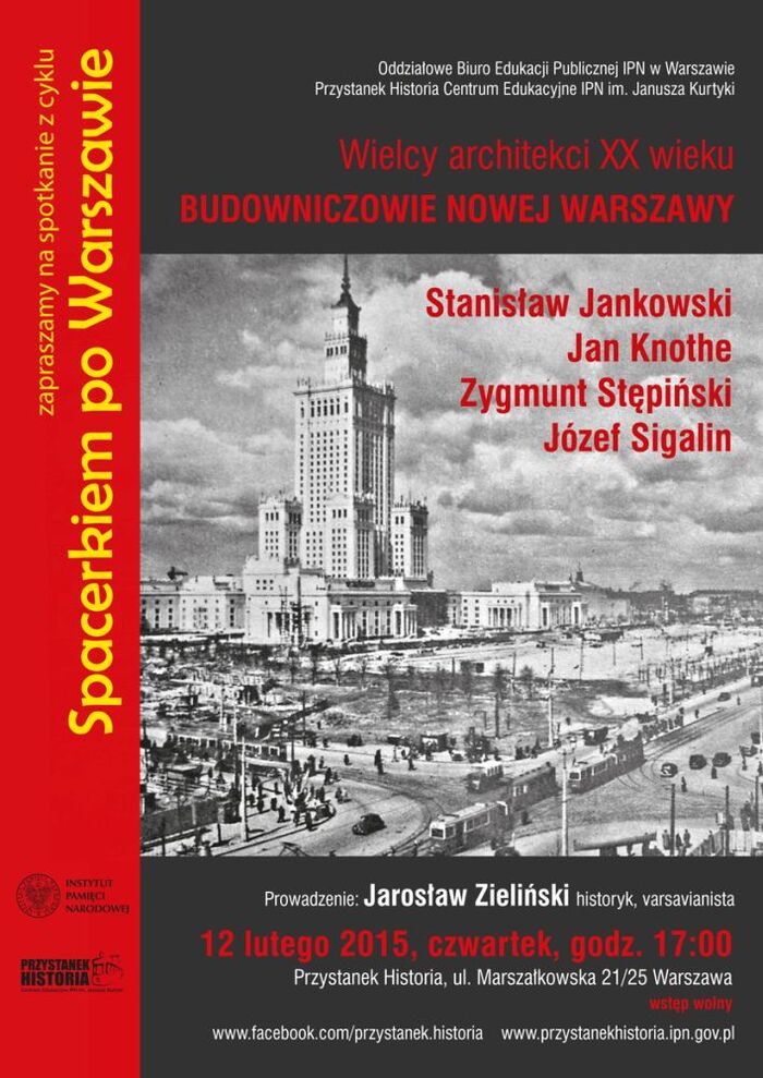 Wykład: Jarosław Zieliński, historyk architektury i jeden z najbardziej cenionych współczesnych varsavianistów, autor m.in. wielotomowego Atlasu dawnej architektury ulic i placów Warszawy, albumu Warszawa zburzona i odbudowana, monografii Realizm socjalistyczny w Warszawie. Urbanistyka i architektura, przewodników historycznych po stołecznych dzielnicach, a także szeregu artykułów dotyczących historii i dziedzictwa Warszawy publikowanych m.in. na łamach „Stolicy” i „Spotkań z Zabytkami”. Ostatnio wspólnie z Jerzym S. Majewskim wydał Spacerownik po żydowskiej Warszawie.