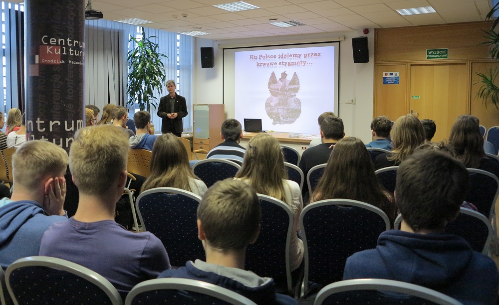 W miniony czwartek, 19 listopada 2015, w sali konferencyjnej Centrum Kultury w Grodzisku Mazowieckim (pod wspólnym szyldem z IPN „Przystanek Historia”) Marcin Łaszczyński z Oddziałowego Biura Edukacji Publicznej IPN w Warszawie przeprowadził zajęcia dla gimnazjalistów „Szkoła i wojna, czyli budowanie Niepodległej”.