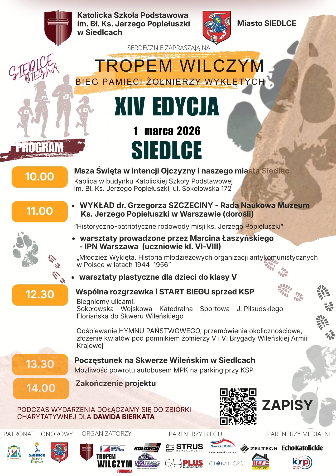Serdecznie zapraszamy do udziału w siedleckich obchodach XIV edycji Biegu Tropem Wilczym, które odbędą się w niedzielę 1 marca 2026 roku. Wydarzenie, będące hołdem dla Żołnierzy Wyklętych, łączy w sobie wymiar sportowy, edukacyjny oraz modlitewny.