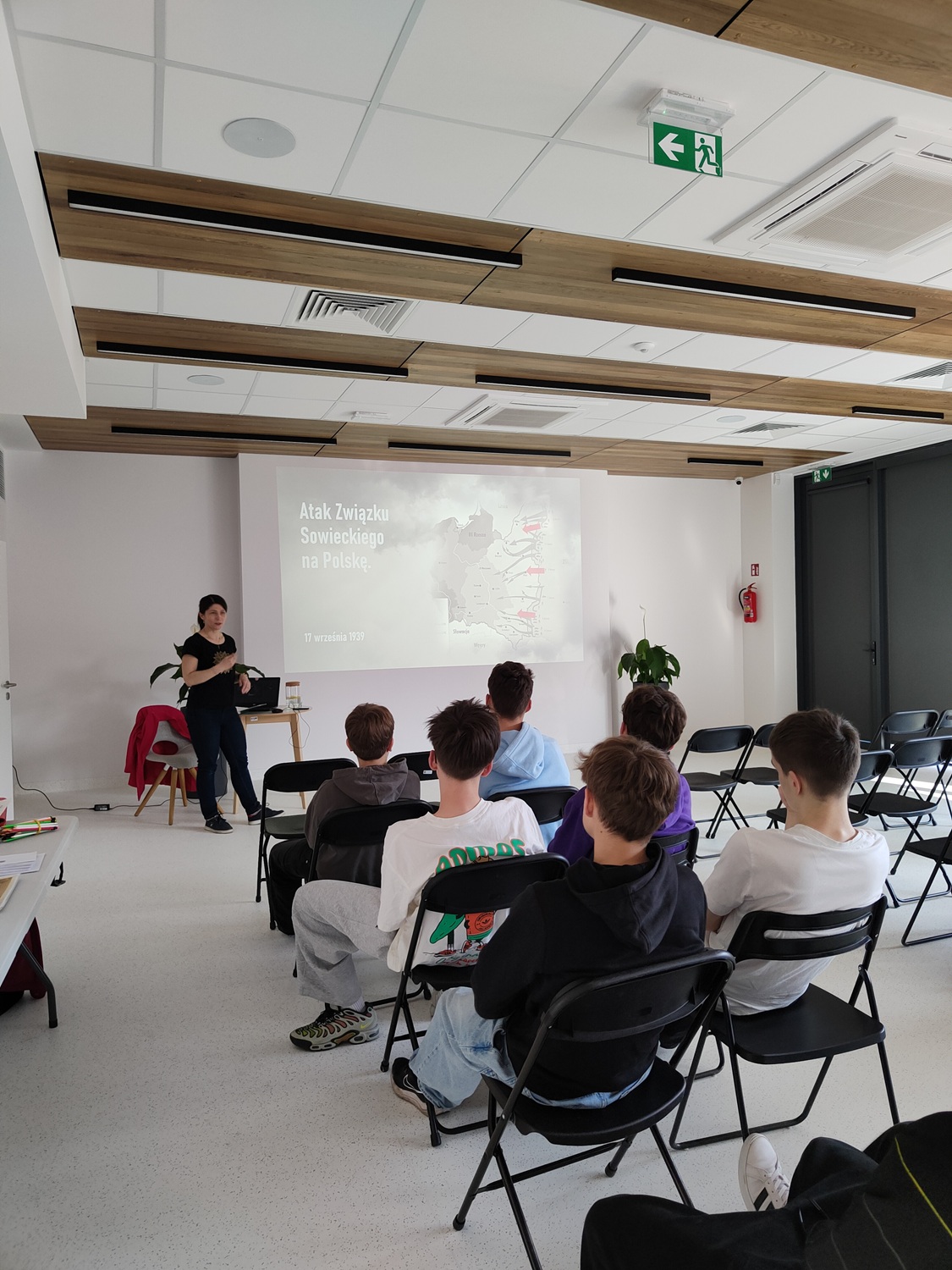 Pierwsze zajęcia przeprowadziliśmy w Pawilonie Kultury – Filii Biblioteki nr 2 w Grodzisku Mazowieckim. Warsztaty poprowadziła Anna Obrębska z Oddziałowego Biura Edukacji Narodowej IPN w Warszawie. W zajęciach wzięli udział uczniowie klas ósmych ze Szkoły Podstawowej nr 2 im. M. Konopnickiej w Grodzisku Mazowieckim.