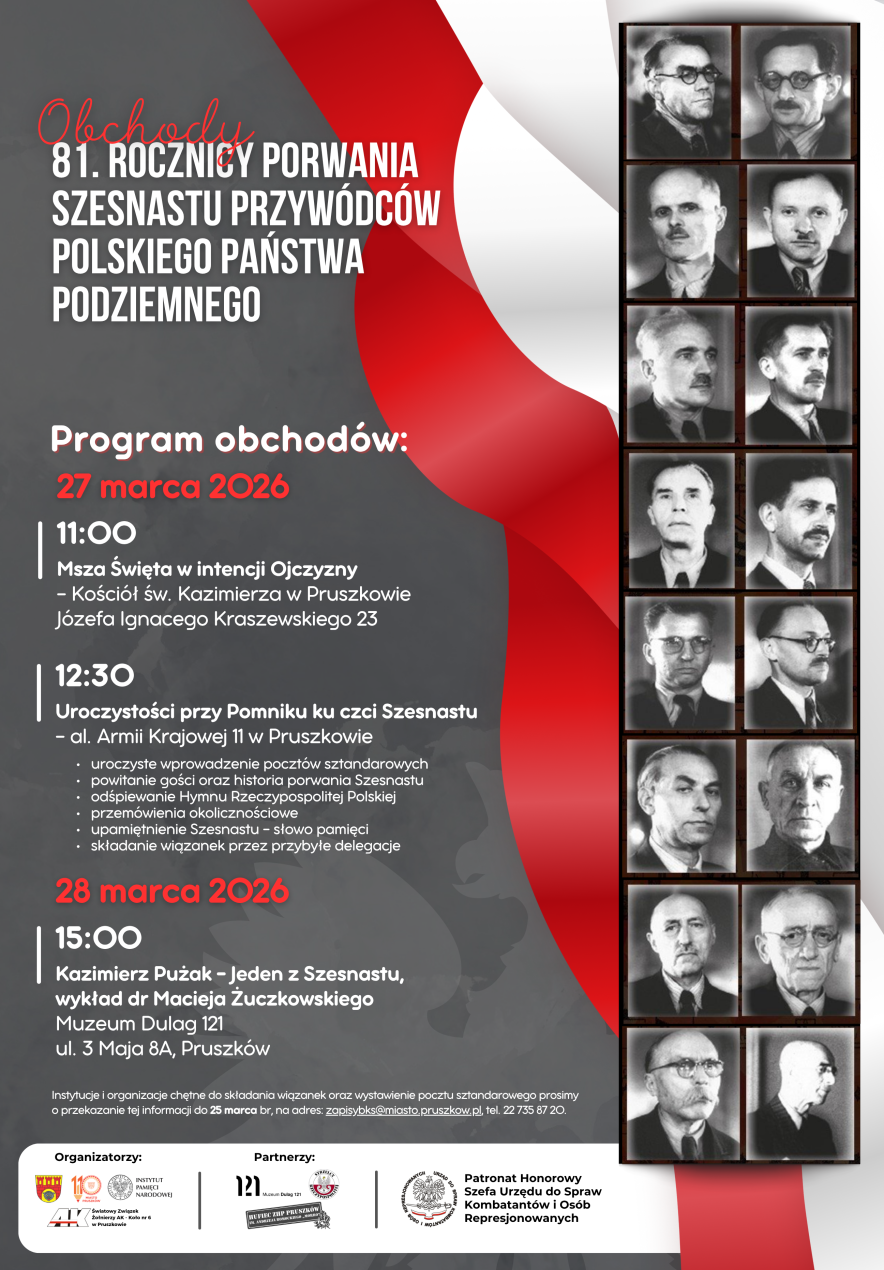 Drugi dzień obchodów, 28 marca 2026 roku o godzinie 15.00, będzie miał charakter edukacyjny. W Muzeum Dulag 121 odbędzie się wykład historyczny, który poprowadzi dr Maciej Żuczkowski. Prelekcja zatytułowana „Kazimierz Pużak – jeden z Szesnastu” przybliży sylwetkę jednego z najważniejszych przedstawicieli Polskiego Państwa Podziemnego.