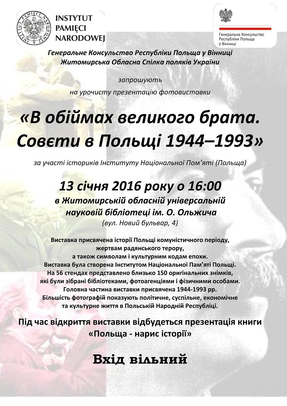 Kolejnym miastem na Ukrainie, które odwiedzili pracownicy IPN był Żytomierz. Tu 13 stycznia w Bibliotece Publicznej im. Olega Olzhycha odbył się wernisaż wystawy „W objęciach Wielkiego Brata. Sowieci w Polsce 1944–1993”, przygotowanej przez warszawski oddział IPN. O ekspozycji opowiedział Jacek Pawłowicz. Natomiast dr Andrzej Zawistowski podarował wszystkim uczestnikom spotkania podręcznik IPN Historia Polski w zarysie (Польща – нарыс історії). Jest to pełny wykład dziejów naszego kraju od Chrztu Polski do czasów najnowszych pisany od początku z myślą o czytelnikach ukraińskich.