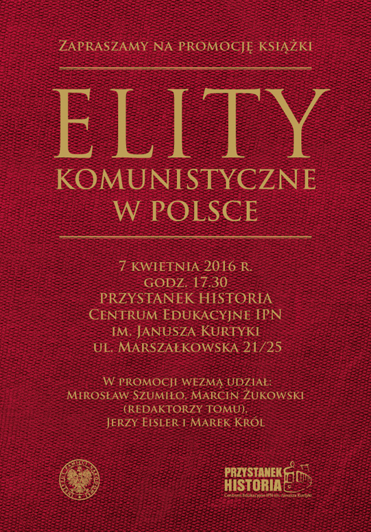 Instytut Pamięci Narodowej serdecznie zaprasza na prezentację książki „Elity komunistyczne w Polsce”, która odbędzie się 7 kwietnia (czwartek) o godz. 17:30 w Centrum Edukacyjnym IPN im. Janusza Kurtyki „Przystanek Historia”, przy ulicy Marszałkowskiej 21/25 w Warszawie.