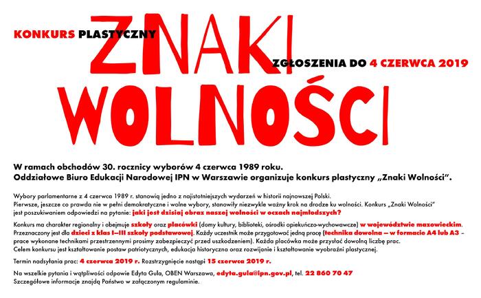 W ramach obchodów 30. rocznicy wyborów 4 czerwca 1989 roku Oddziałowe Biuro Edukacji Narodowej IPN w Warszawie organizuje konkurs plastyczny „Znaki Wolności”.