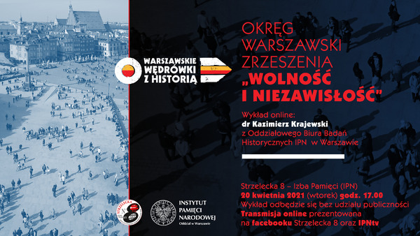 16/04/2021Retransmisja„Okręg Warszawski Zrzeszenia »Wolność i Niezawisłość«” – wykład online w ramach cyklu spotkań na Strzeleckiej 8 pt. „Warszawskie wędrówki z historią” – Warszawa, 20 kwietnia 2021 (Transmisja na facebooku Strzelecka 8 i IPNtv).