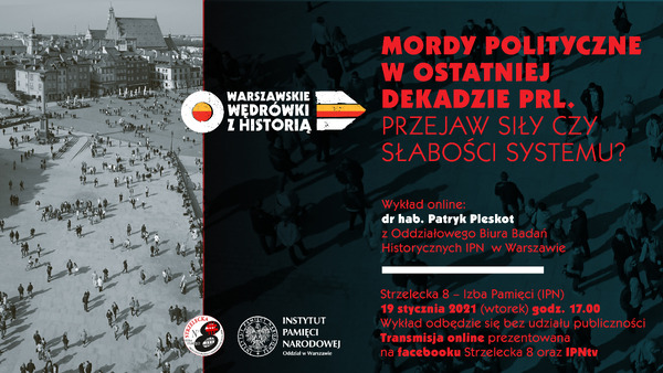 12/01/2021Retransmisja„Mordy polityczne w ostatniej dekadzie PRL. Przejaw siły czy słabości systemu?" – wykład online w ramach cyklu spotkań na Strzeleckiej 8 pt. „Warszawskie wędrówki z historią” – Warszawa, 19 stycznia 2021 (Retransmisja na facebooku Strzelecka 8 i IPNtv).