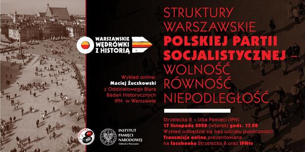 10/11/2020Retransmisja„Warszawskie struktury Polskiej Partii Socjalistycznej – Wolność Równość Niepodległość” – wykład online w ramach cyklu spotkań na Strzeleckiej 8 pt. „Warszawskie wędrówki z historią” – Warszawa, 17 listopada 2020 (Transmisja na facebooku Strzelecka 8 i IPNtv)