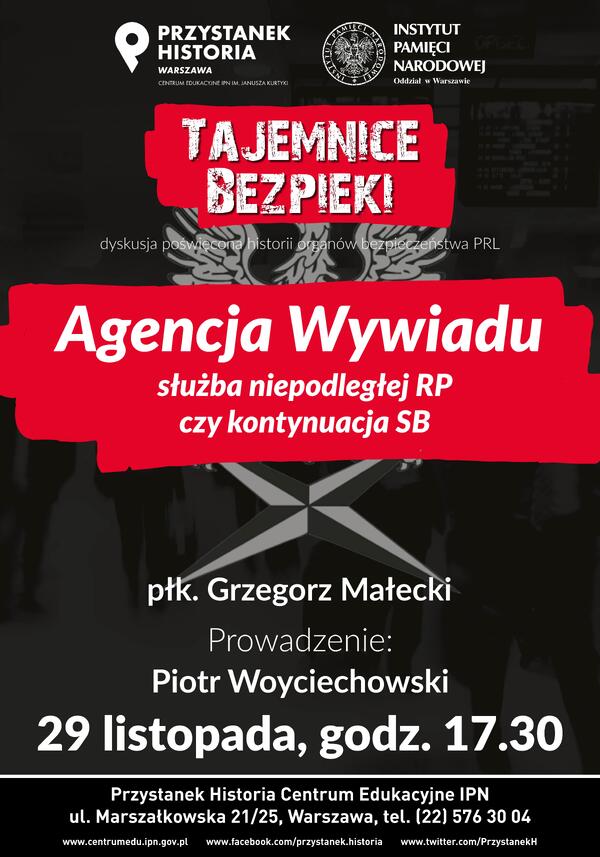 26/11/2021Retransmisja„Agencja Wywiadu – służba niepodległej RP czy kontynuacja SB” – dyskusja online z cyklu „Tajemnice bezpieki” – Warszawa, 29 listopada 2021